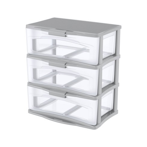 Now you can store and go thanks to the bella 3 drawer cart with clear drawers and silver handles.